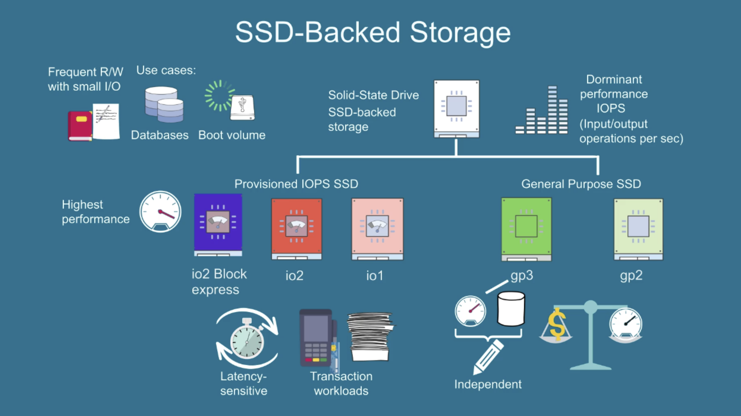 - DB / OS / 트랜잭션 → SSD (gp3, io2)